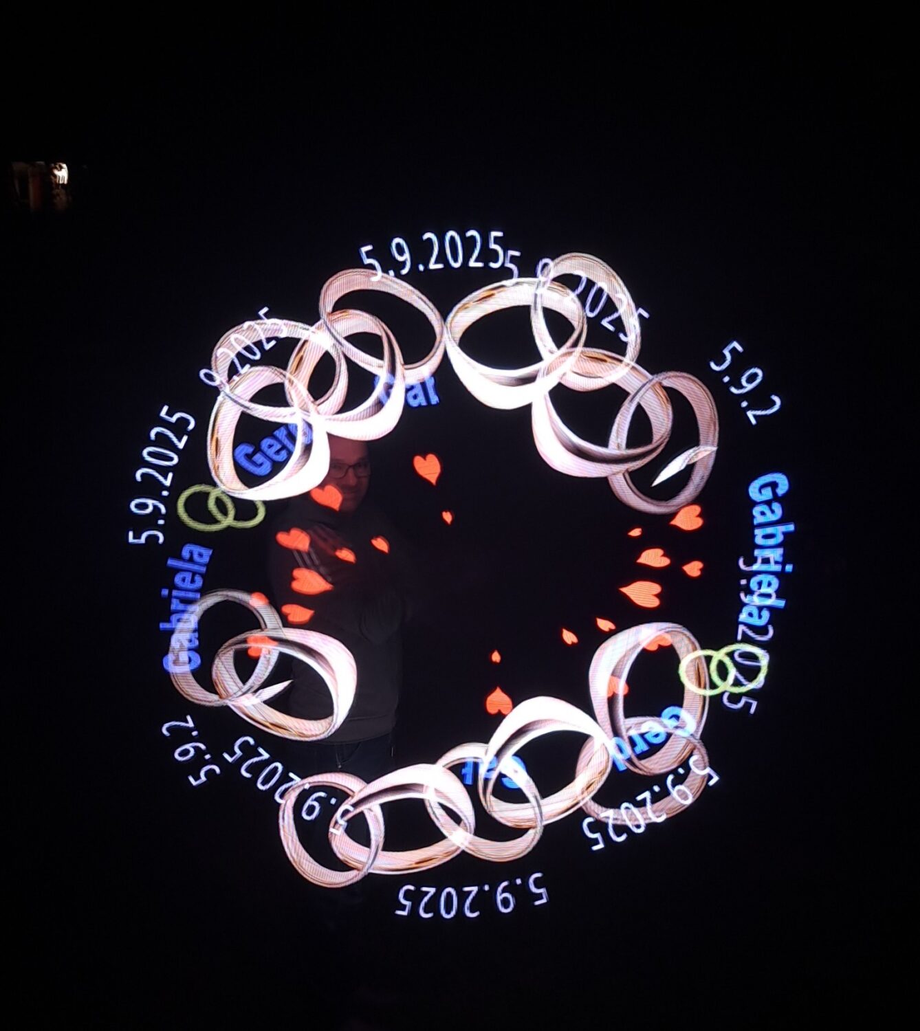 Bei diesem modernen Show-Act wird neueste LED-Technik eingesetzt, die es ermöglicht Texte, Grafiken und richtige Fotos darzustellen. So kann das Foto vom Brautpaar durch schnelles und kunstvolles Drehen der LED-Poi in den Lichtspuren zu sehen sein. Viele weitere Individualisierungen sind machbar – Ringe, Hochzeitsdatum und leuchtende Herzen sind nur einige Elemente in der Hochzeitsshow. Selbst ein Foto von Ihrem Haustier ist möglich. 🙂 So entsteht eine Überraschungsshow mit individuellen Inhalten!